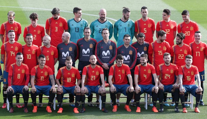 Con el cuerpo técnico en el medio de la imagen escoltados por los tres porteros -David De Gea, Pepe Reina y Kepa- con un traje verde con líneas horizontales negras, a la izquierda Sergio Ramos, a la derecha Andrés Iniesta y en el centro de la fila de abajo David Silva, los capitanes, el resto de internacionales se repartieron en las tres filas de la imagen.