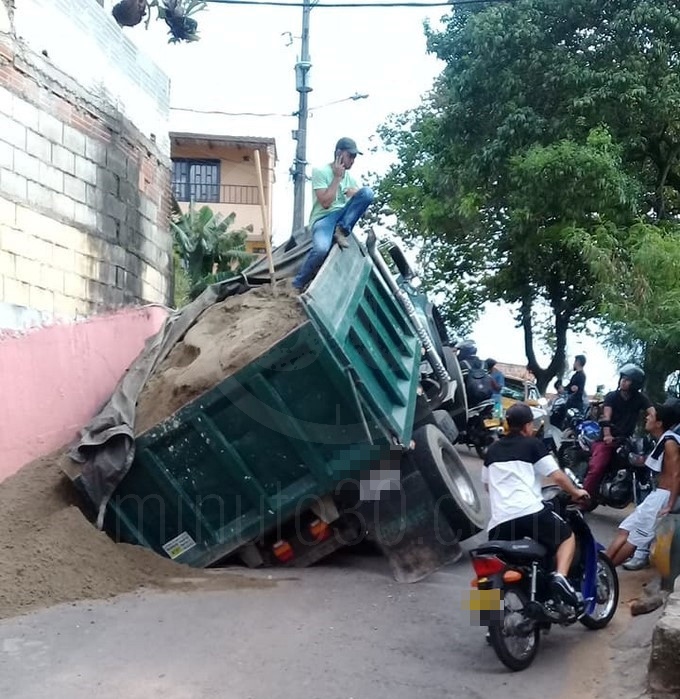 Según relataron los testigos, cuando el vehículo se movilizaba por una calle en aparente buen estado, esta se abrió y la volqueta quedó atrapada en el asfalto.