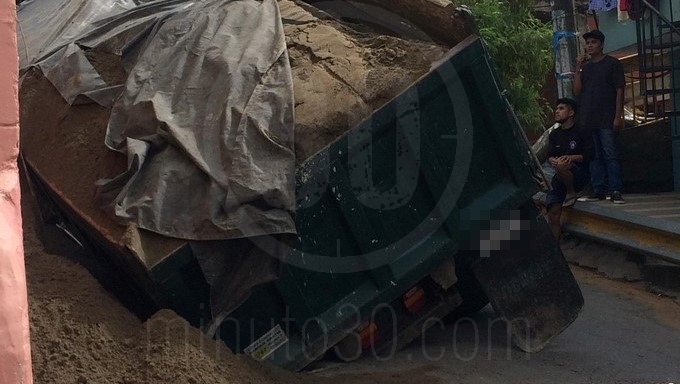 Según relataron los testigos, cuando el vehículo se movilizaba por una calle en aparente buen estado, esta se abrió y la volqueta quedó atrapada en el asfalto.