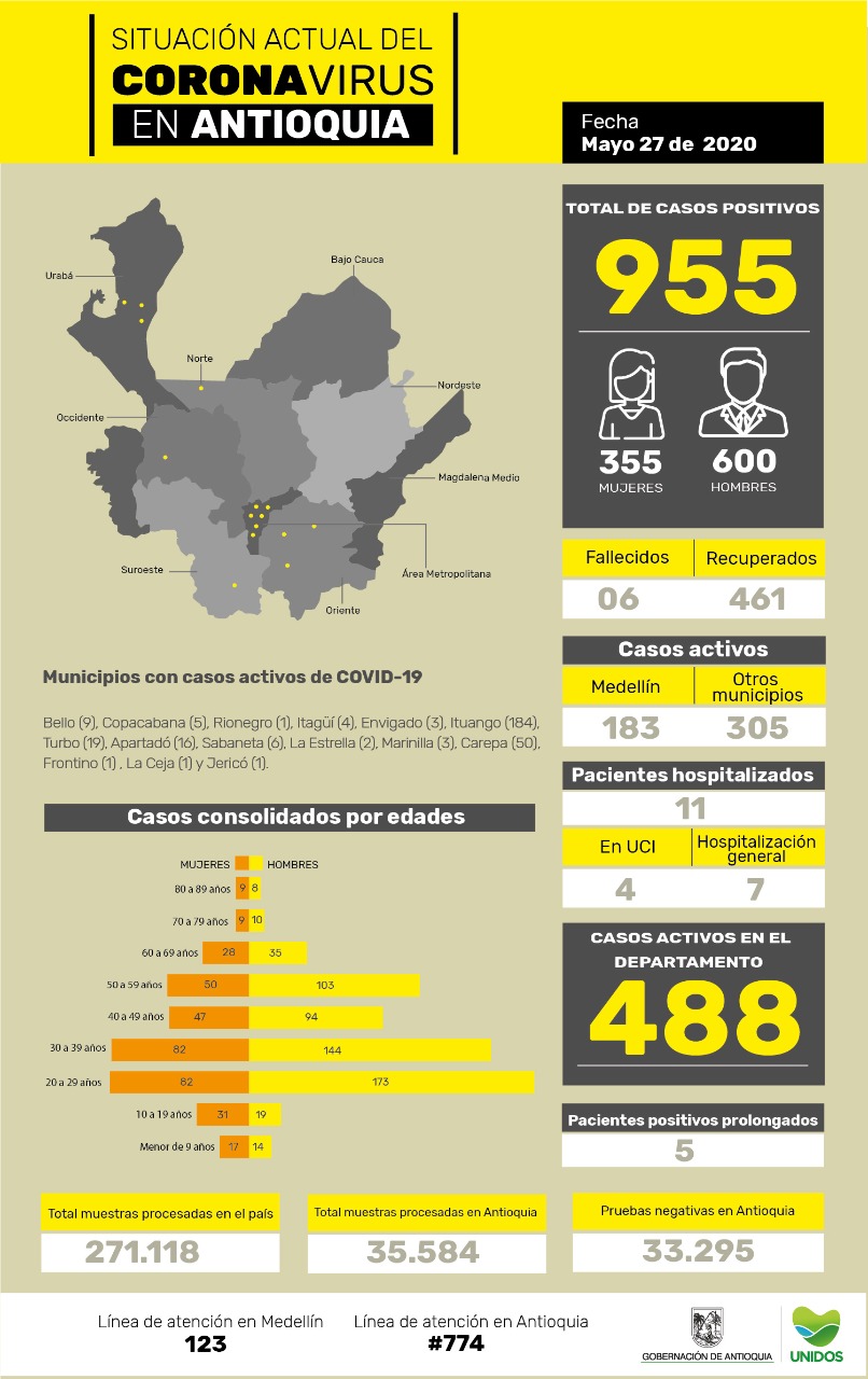 Todos fueron previamente identificados, puestos en aislamiento y bajo la vigilancia epidemiológica correspondiente. Con estos nuevos casos, la cifra de personas contagiadas en Antioquia se eleva a 955. De ellos 355 son mujeres y 600 son hombres.