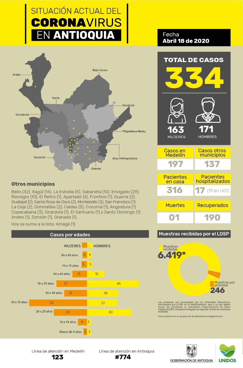 Del consolidado, 197 están en Medellín, hay uno en estudio y los 137 restantes están distribuidos así en el departamento: Amagá (1), Andes (1), Angostura (1), Apartadó (4), Bello (32), Caldas (5), Cocorná (1), Copacabana (3), Donmatías (2), El Retiro (1), El Santuario (1), Envigado (29), Frontino (1), Girardota (1), Granada (1), Guarne (2), Guatapé (2), Itagüí (14), La Ceja (2), La Estrella (5), Montebello (3), Rionegro (10), Sabaneta (10), San Francisco (1), Santa Rosa de Osos (2), Sonsón (1) y Santo Domingo (1). Todos los casos ya habían sido previamente identificados por las autoridades de salud y puestos en aislamiento preventivo.