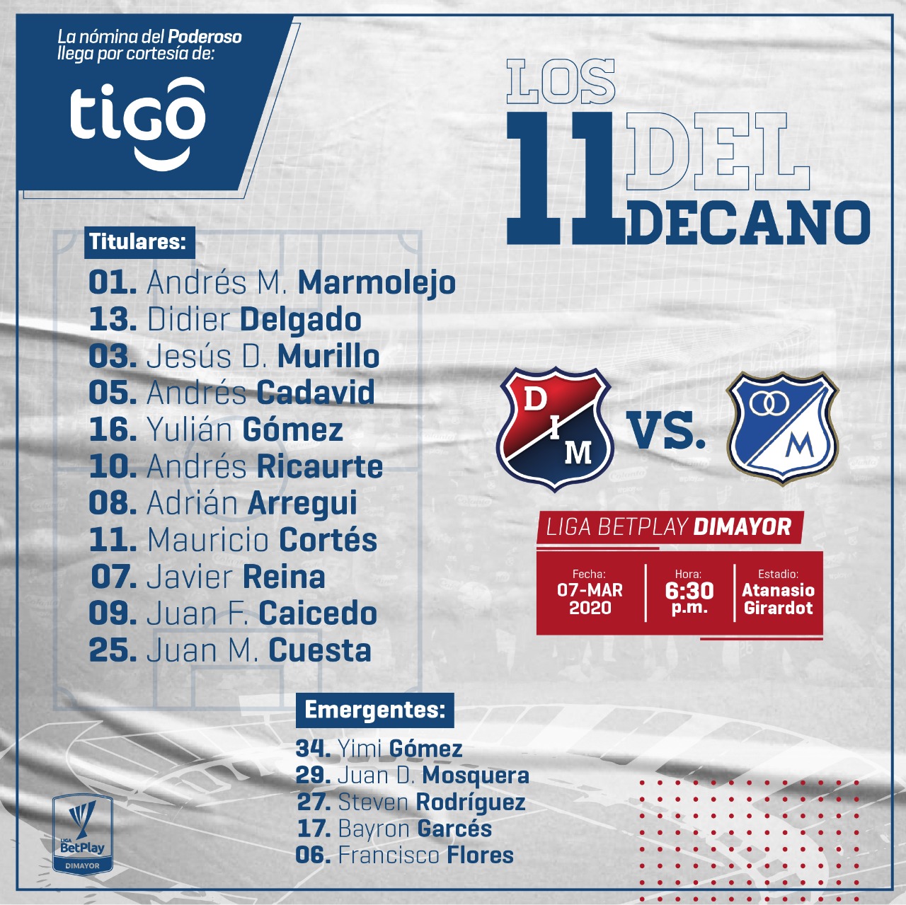 El Deportivo Independiente Medellín jugará esta tarde contra el Club Millonarios a partir de las 6:30 disponiendo de la siguiente formación inicialista.