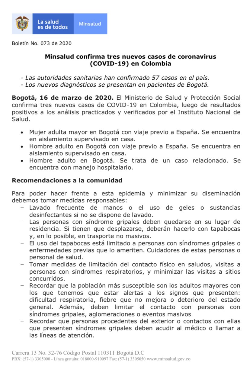 El Ministerio de Salud informó que se presentaron tres nuevos casos de Covid-19, todos ellos en la ciudad de Bogotá, llegando así a un total de 57 en el país.