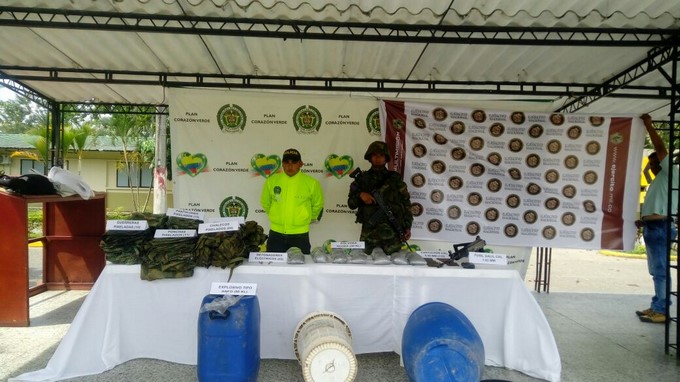 Según el reporte de las autoridades, en el sitio encontraron, “dos canecas de 40 galones, en cuyo interior se encontró material de guerra e intendencia: un fusil Galil 7.62 sin serial, un cartucho calibre 7.62 mm, 112 cartuchos calibre 5.56 mm, 10 guerreras pixeladas, 5 pantalones camuflados, 4 chalecos pixelados, 11 ponchos pixelados, una cintela, un timbo con aproximadamente 80 kilos de anfo, 30 kilogramos de pólvora negra, dos granadas 120 mm, fabricación artesanal”.