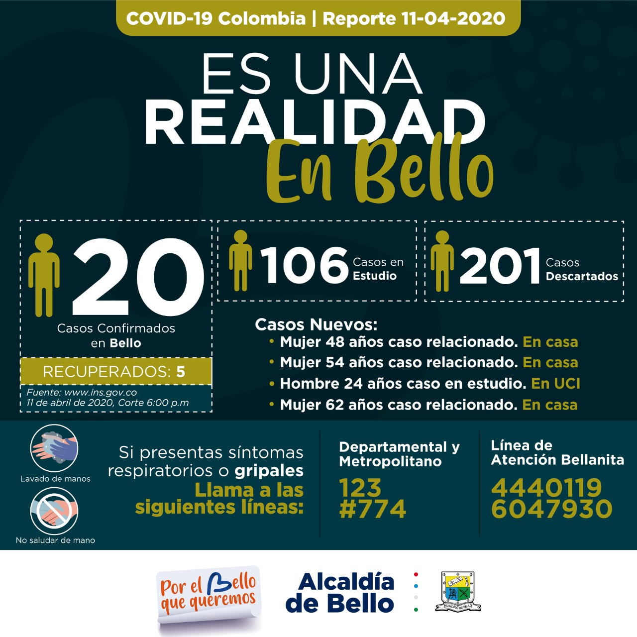 La Alcaldía de Bello reportó el día de hoy, que este municipio del norte del Valle de Aburrá, ya cuenta con 20 contagiados con COVID-19, cinco de ellos recuperados.
