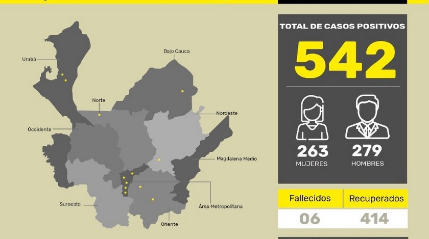 El informe indica que, a la fecha, hay 122 casos activos en el departamento y la cifra de personas recuperadas asciende a 414. De los activos, en Medellín hay 86 casos y los 36 restantes están distribuidos así en los siguientes municipios: Ituango (11), Bello (7), Apartadó (5), Copacabana (4), Envigado (2), Cisneros (1), Itagüí (1), La Estrella (1), El Bagre (1), Turbo (1), Rionegro (1) y El Carmen de Viboral (1).