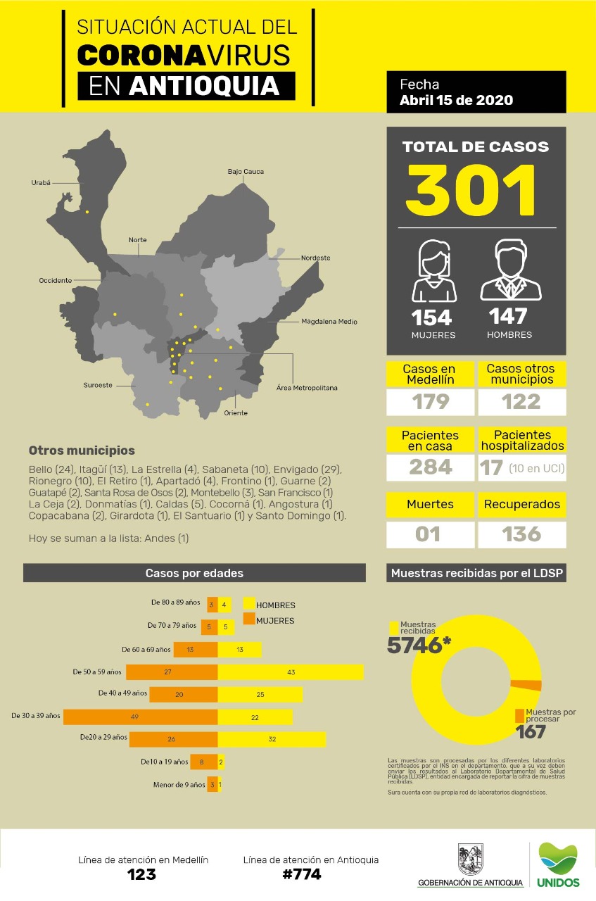 la Secretaría de Salud del Departamento de Antioquia reportó 12 nuevos casos con coronavirus, diez (10) nuevos para Medellín, uno (1) para Andes y uno (1) para Envigado, para un total de 301 en todo el territorio antioqueño.