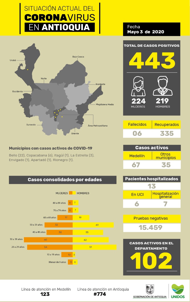 El reporte indica, además, que Antioquia tiene siete (7) casos nuevos: seis (6) en Medellín y uno (1) en Bello, lo que eleva la cifra total de contagiados a 443. De estos casos positivos en el departamento, 219 son en hombres y 224 en mujeres. Además, a la fecha se registran 15.459 pruebas negativas.