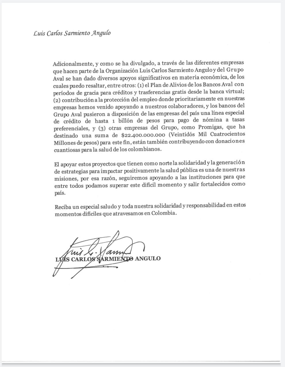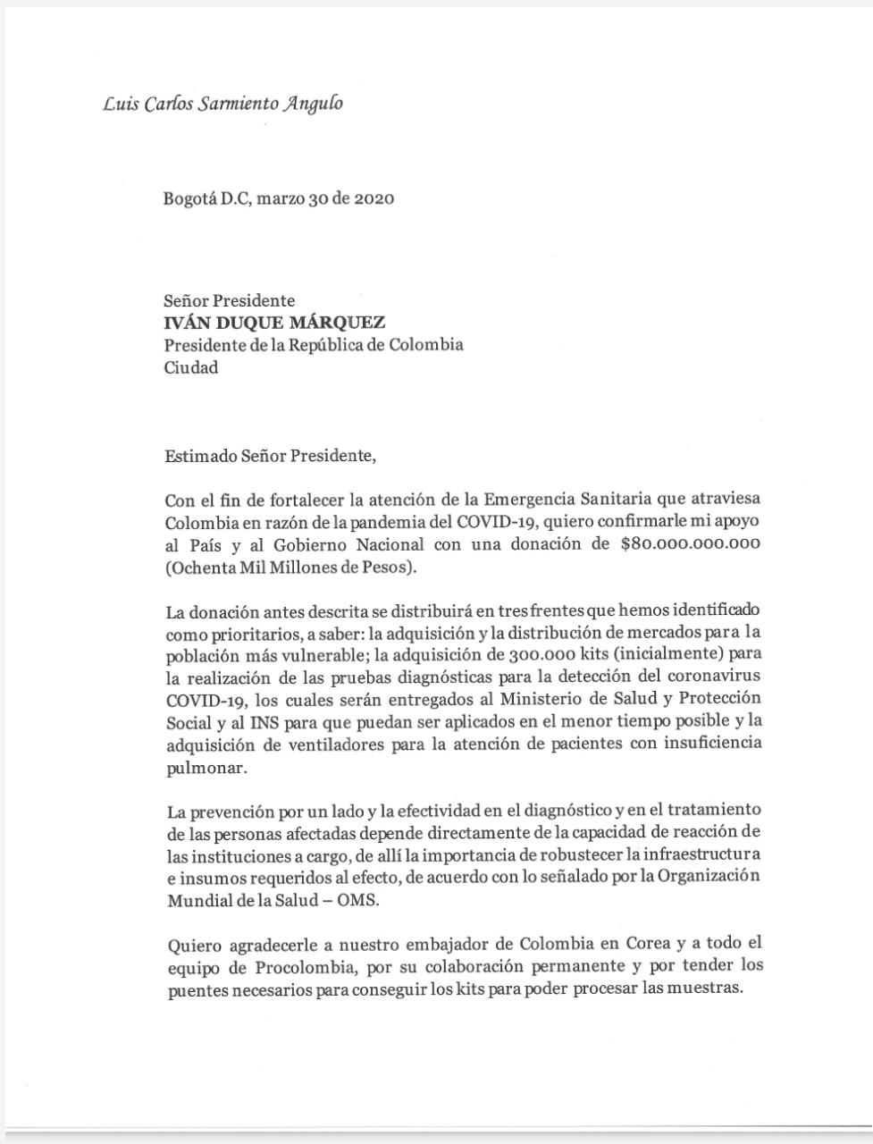 Por medio de una carta enviada al presidente Iván Duque, Luis Carlos Sarmiento anunció una donación por $80.000 millones para enfrentar la crisis causada por el Covid-19 en el país.