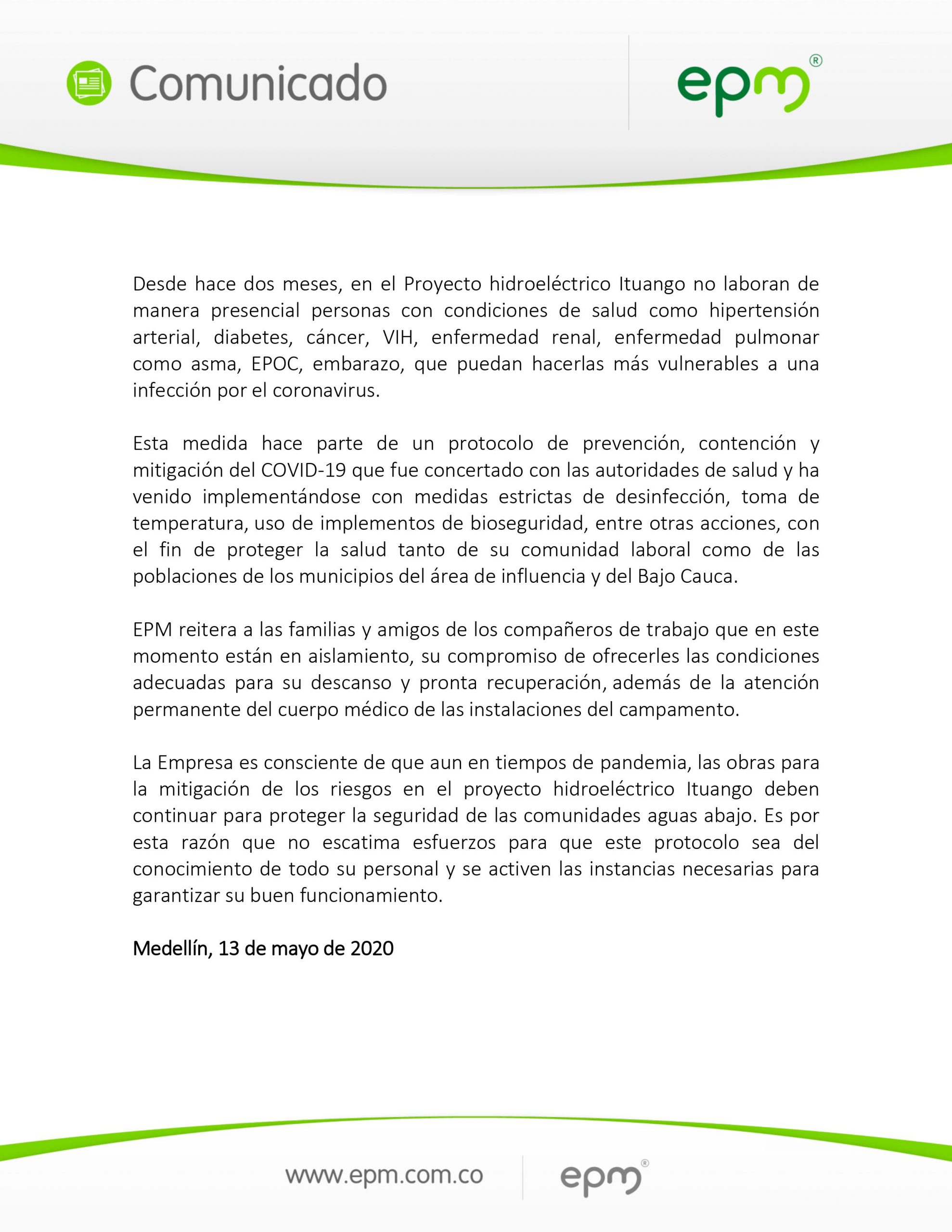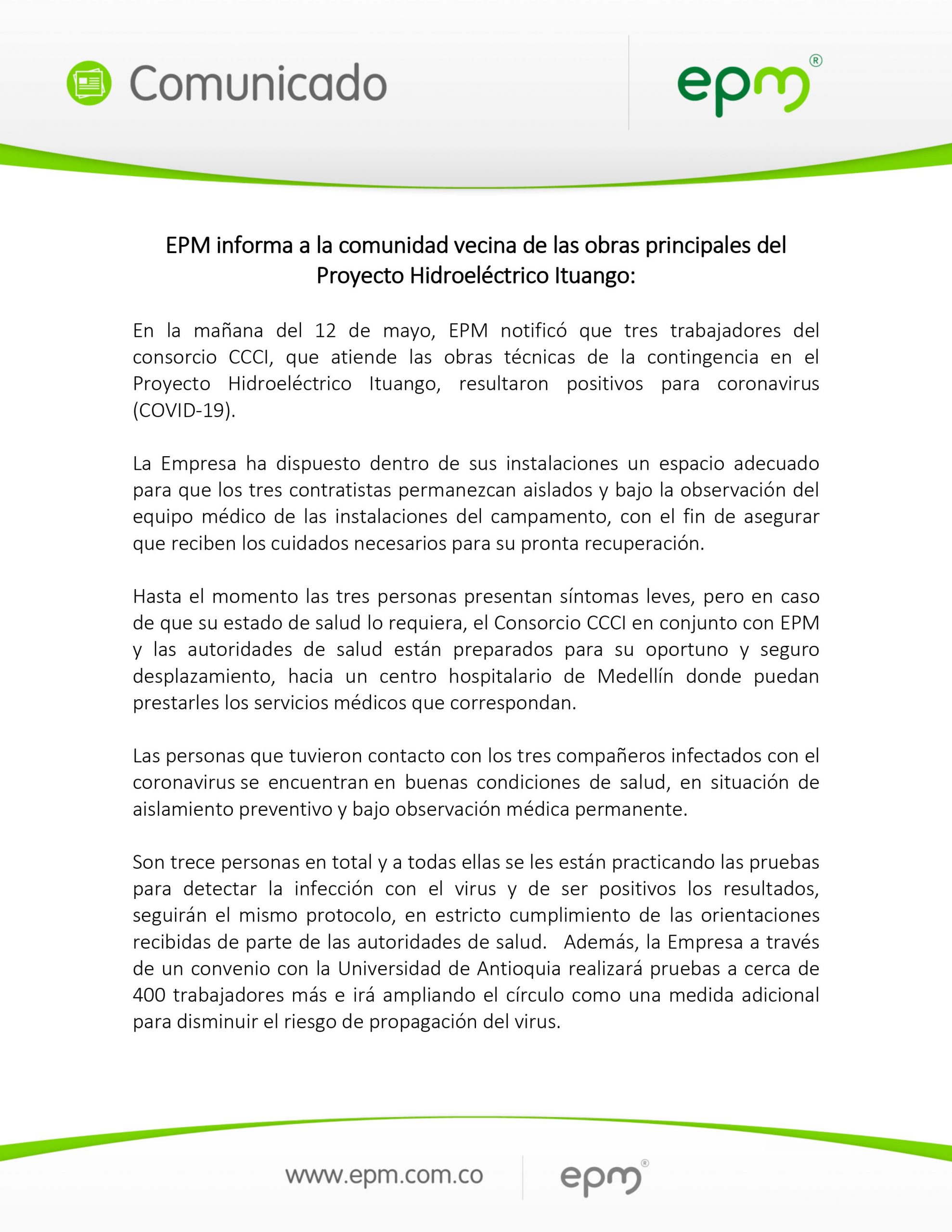 Mediante un comunicado de prensa, EPM dijo que “la empresa ha dispuesto dentro de sus instalaciones un espacio adecuado para que los tres contratistas permanezcan aislados y bajo la observación del equipo médico de las instalaciones del campamento, con el fin de asegurar que reciben los cuidados necesarios para su pronta recuperación”.