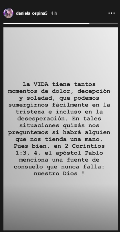 Así lo afirmó Ospina este martes 16 de julio en una historia con fondo gris. “En tales situaciones quizás nos preguntemos si habrá alguien que nos tienda una mano. 1:3, 4, el apóstol Pablo menciona una fuente de consuelo que nunca falla: ¡nuestro Dios!”.