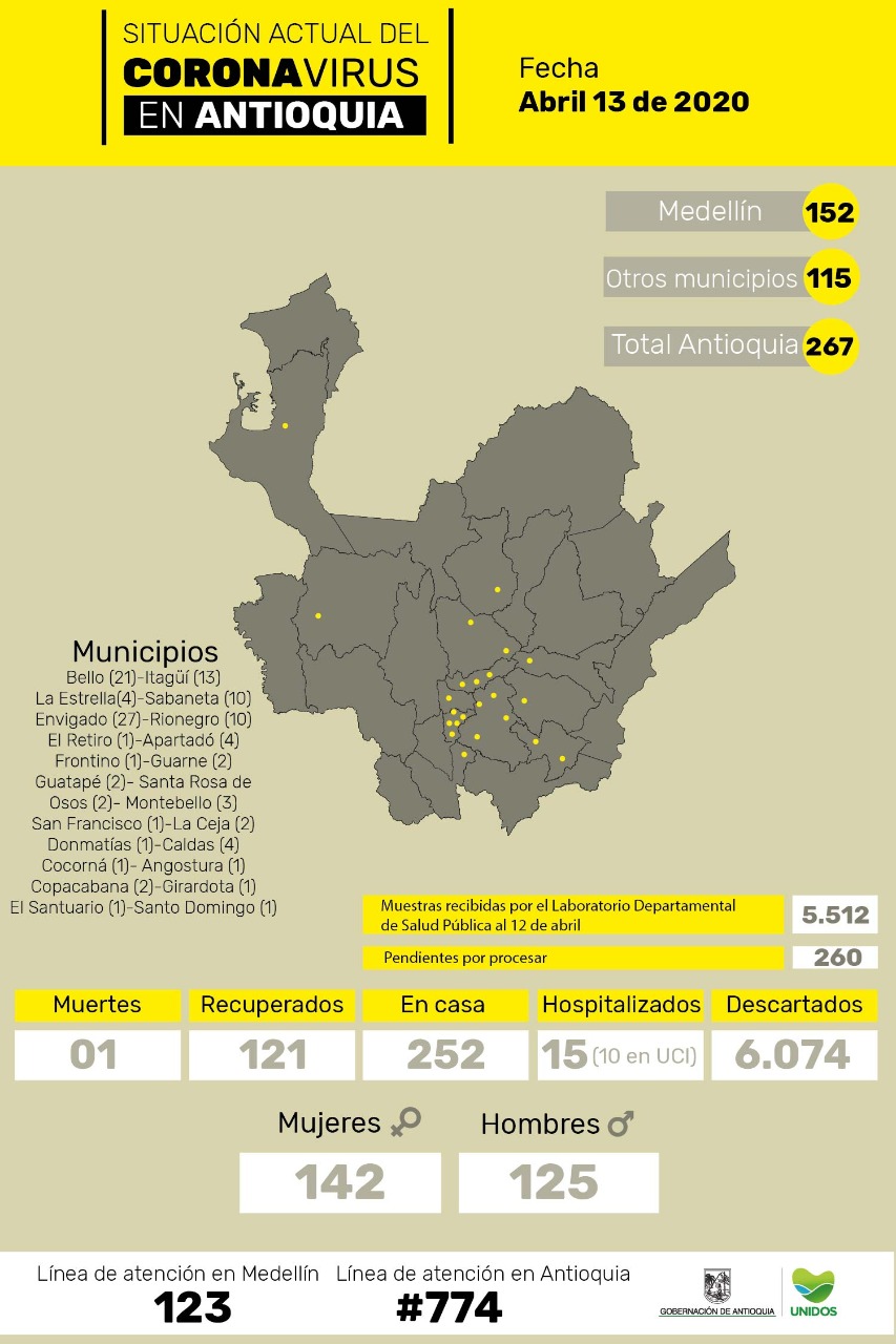 Así mismo, Antioquia registra un total de 267 casos de contagio por coronavirus. Del consolidado, 152 están en Medellín y los 115 restantes están distribuidos así en el departamento: Angostura (1), Apartadó (4), Bello (21), Caldas (4), Cocorná (1), Copacabana (2), Donmatías (1), El Retiro (1), El Santuario (1), Envigado (27), Frontino (1), Girardota (1), Guarne (2), Guatapé (2), Itagüí (13), La Ceja (2), La Estrella (4), Montebello (3), Rionegro (10), Sabaneta (10), San Francisco (1), Santa Rosa de Osos (2) y Santo Domingo (1). Todos los casos ya habían sido previamente identificados por las autoridades de salud y puestos en aislamiento preventivo.