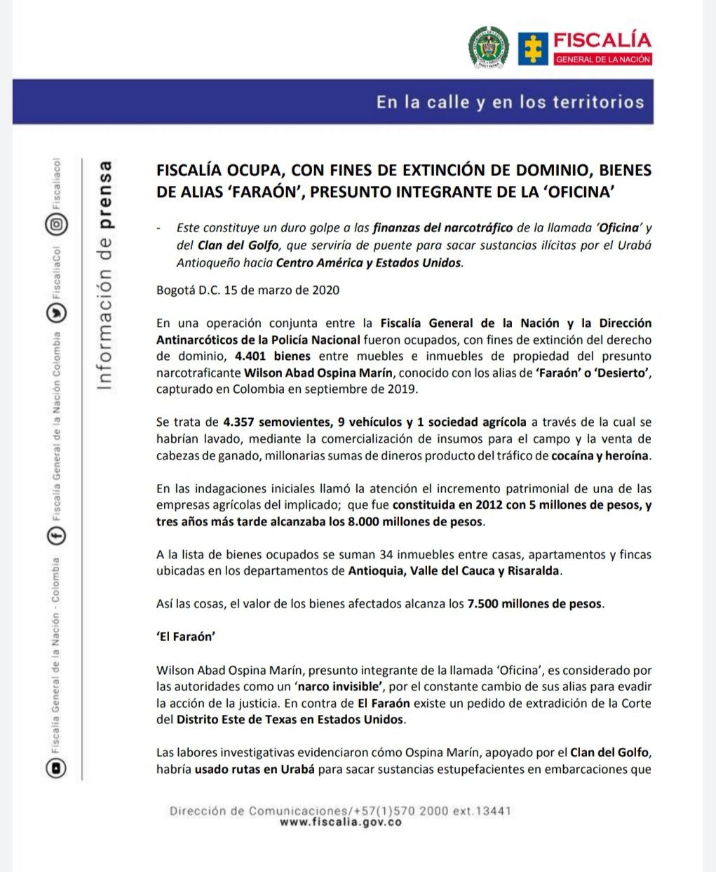 En operación conjunta entre la Fiscalía General de la Nación y la Dirección de Antinarcóticos de la Policía fueron ocupados con fines de extinción de dominio 4.401 bienes del presunto narcotraficante Wilson Abad Ospina M, alias “Faraón o Desierto”.