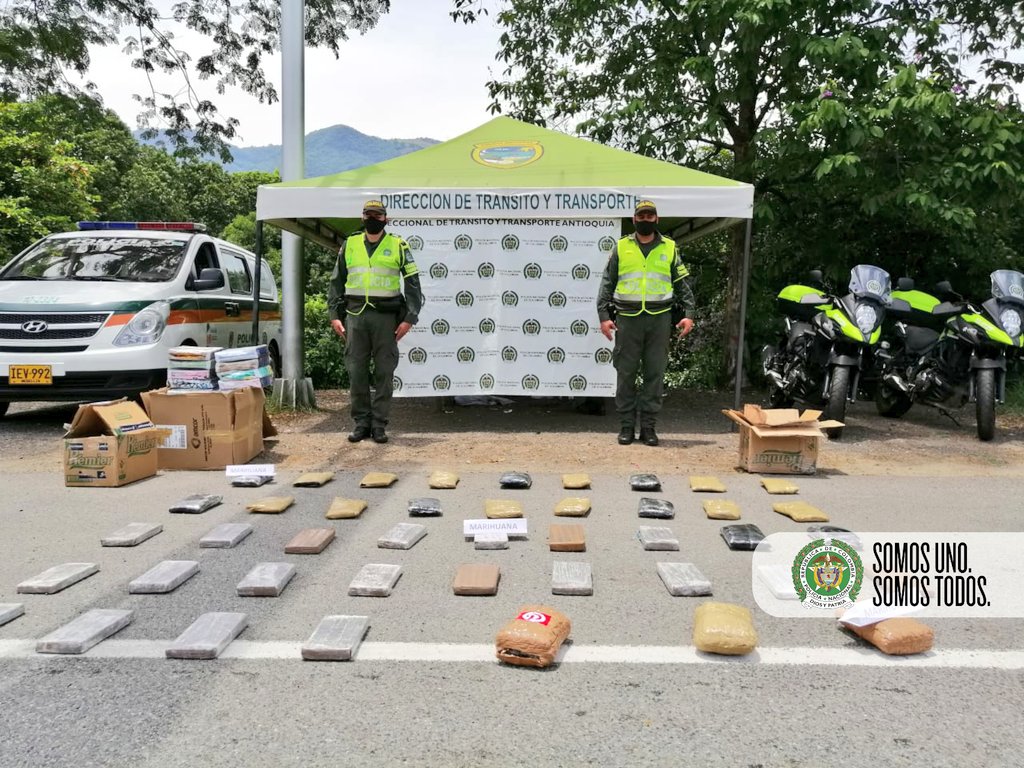 Nuestros uniformados de @TransitoPolicia en #LaPintada incautaron 43 kilos de marihuana en el sector El Planchón, avaluados en $21.500.000, transportados en modalidad de encomienda, cubría la ruta Armenia – Medellín. #SomosUnoSomosTodos pic.twitter.com/FJY23e01W4