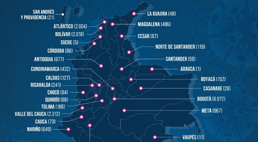Así mismo, para hoy sábado 23 de mayo se reportaron 1.046 nuevos casos, los cuales se ubican en: Bogotá (382), Cartagena (166), Barranquilla (147), Valle (103), Atlántico (85), Antioquia (61), Cundinamarca (31), Nariño (15), Bolívar (12), Boyacá (8), Cesar (7), Santander (6), Tolima (5), Santa Marta (3), Huila (2), Quindío (2), Amazonas (2), Cauca (2), Chocó (2), Caldas (1), Risaralda (1), Córdoba (1), La Guajira (1) y Meta (1)