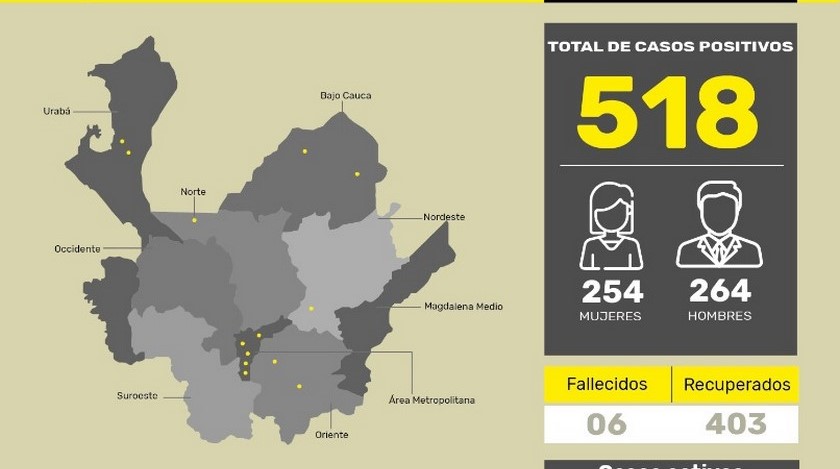 El informe indica que, a la fecha, hay 109 casos activos en el departamento y la cifra de personas recuperadas asciende a 403. De los activos, en Medellín hay 79 casos y los 30 restantes están distribuidos así en los siguientes municipios: Bello (7), Copacabana (6), Ituango (3), Itagüí (2), La Estrella (2), Envigado (2), Apartadó (2), El Bagre (1), Turbo (1), El Carmen de Viboral (1), Cisneros (1), Caucasia (1) y Rionegro (1).