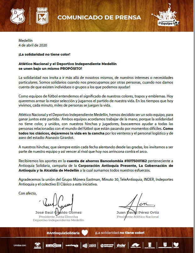 Atlético Nacional y el Deportivo Independiente Medellín, hemos decidido ser un solo equipo, para ganar juntos este partido. Ambos equipos acordamos trabajar de la mano, porque la solidaridad no tiene color, y unidos, con nuestros hinchas y jugadores, buscaremos ayudar a todas las personas relacionadas con el mundo del fútbol que están pasando por momentos difíciles.