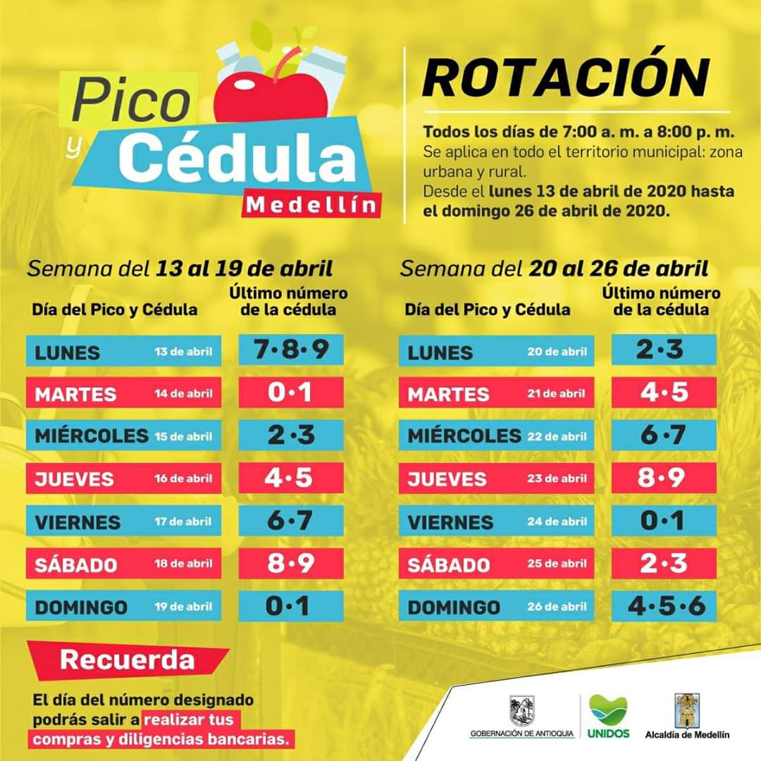 La Alcaldía de Medellín informó la nueva rotación del pico y cédula en la ciudad para la semana del 20 al 26 de abril como medida preventiva para evitar el contagio de la COVID-19.