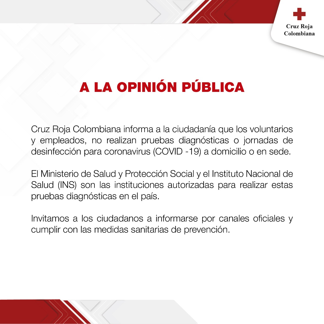 La Cruz Roja Colombiana mediante un comunicado de prensa dijo que esta entidad no realiza pruebas diagnósticas o jornadas de desinfección por caso Covid-19 a domicilio o en sede.