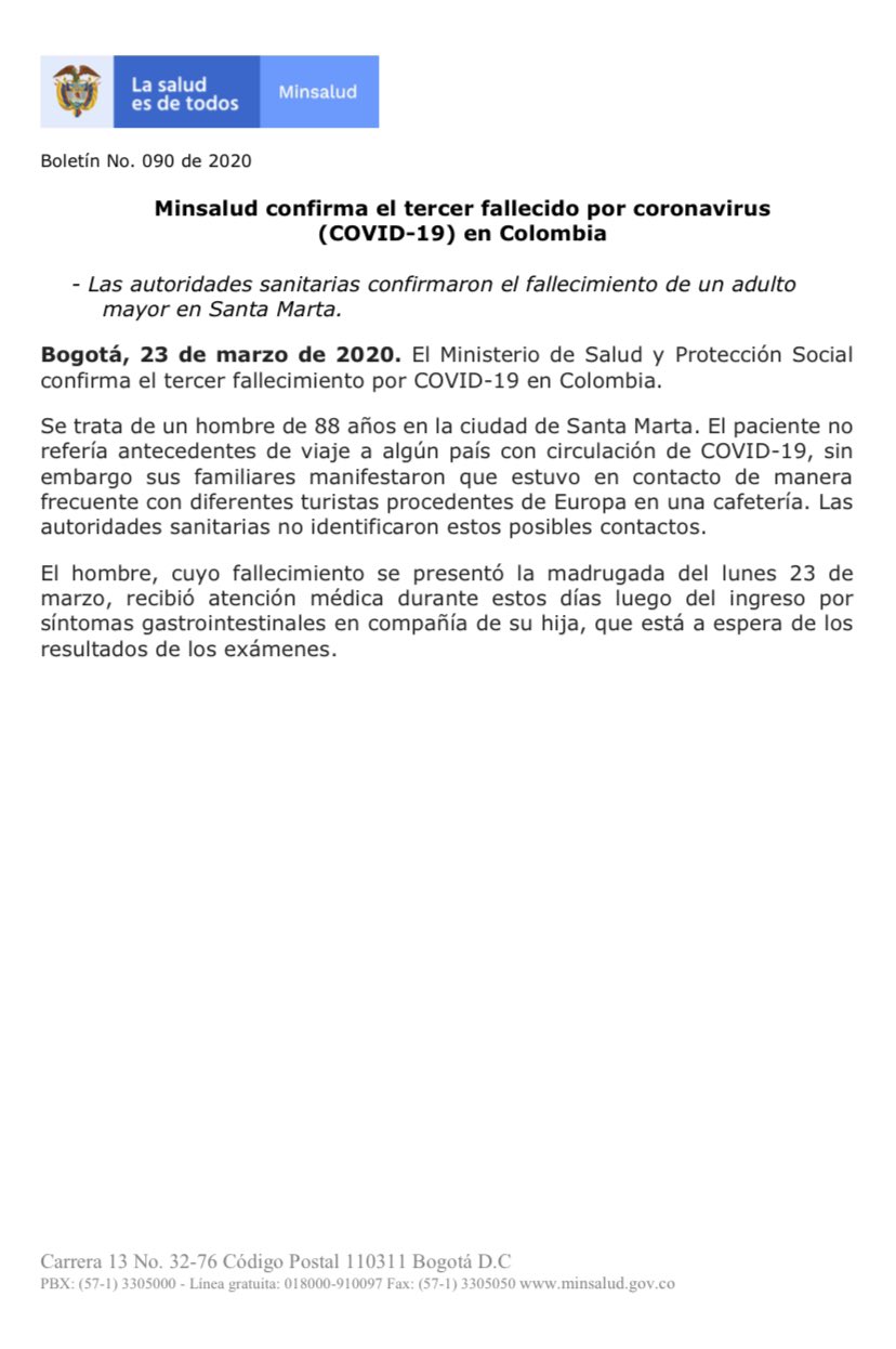 El Ministerio de Salud confirmó un nuevo fallecimiento por Covid-19 en el país, esta vez en la ciudad de Santa Marta.