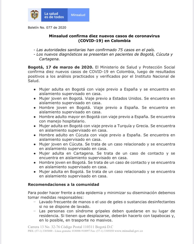 Con la Confirmación de 10 nuevos casos de Covid-19 en Colombia en pacientes de la ciudad de Bogotá, Cúcuta y Cartagena, la cifra de casos en el país es de 75.