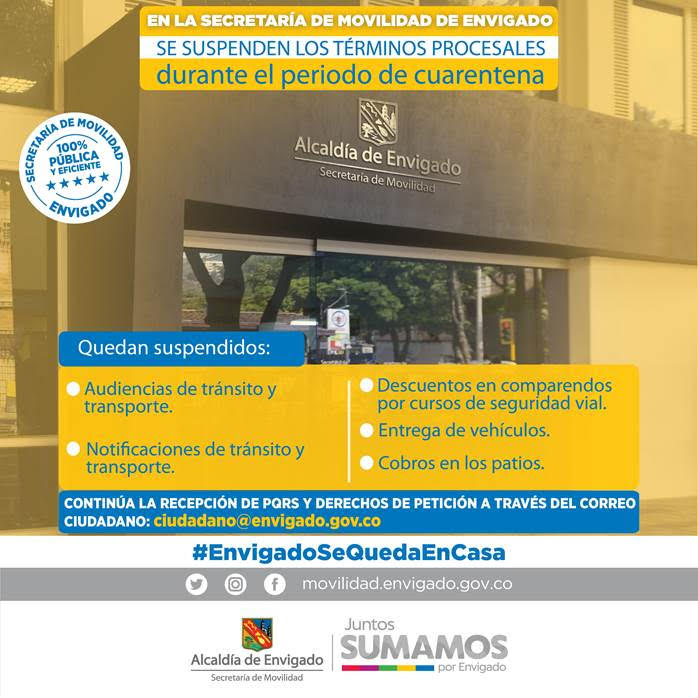 La Secretaría de Movilidad del municipio de Envigado, suspendió hasta el 13 de abril los términos procesales luego que el Gobierno Nacional comunicará el aislamiento preventivo obligatorio y que está programado hasta esa fecha.