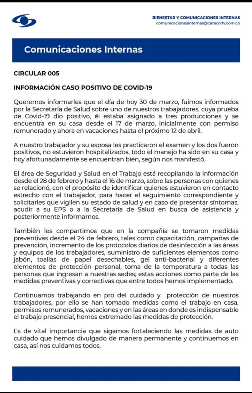 En un comunicado emitido por este medio de comunicación dicen que “fuimos informados por la Secretaría de Salud sobre un trabajador de Caracol Televisión cuya prueba de Covid-19 dio positiva, el estaba asignado a tres producciones y se encuentra en su casa desde el 17 de marzo, inicialmente con permiso remunerado y ahora con vacaciones hasta el próximo 27 de abril.