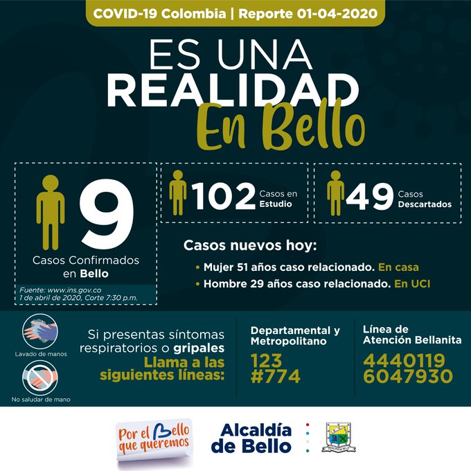 Hoy más que nunca quedarnos en casa es la mejor opción. #Bellanita te queremos vivo y sano, cuídate. pic.twitter.com/PbntfC3FuN— Alcaldía de Bello (@AlcaldiadeBello) April 2, 2020