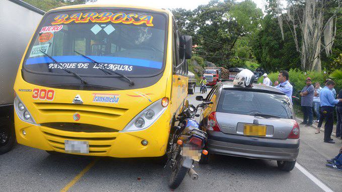 Cuentan testigos que un furgón se encontraba varado en la vía, sin la señalización pertinente; en ese momento un bus trataba de adelantarle de manera lenta y un vehículo particular pasaba por el carril contrario cuando un motoclista pretendió ganarle el puesto al Renault Clio yendo a parar contra el bus de la empresa Transmeba que había salido de Medellín.