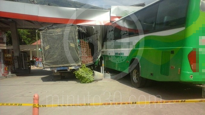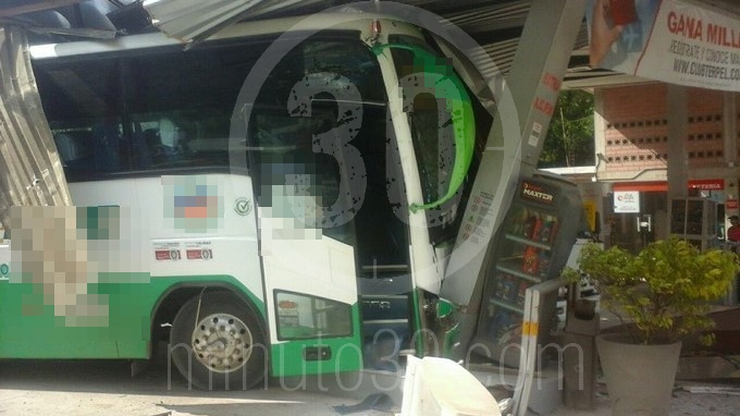 Según el reporte de la ciudadanía a Minuto30.com el bus habría chocado contra la estación de gasolina por evadir una motocicleta.