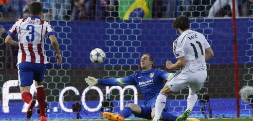 El centrocampista galés del Real Madrid Gareth Bale (d) dispara a puerta ante el portero esloveno del Atlético de Madrid Jan Oblak (2d), durante el partido de ida de cuartos de final de Liga de Campeones disputado en el estadio Vicente Calderón. EFE