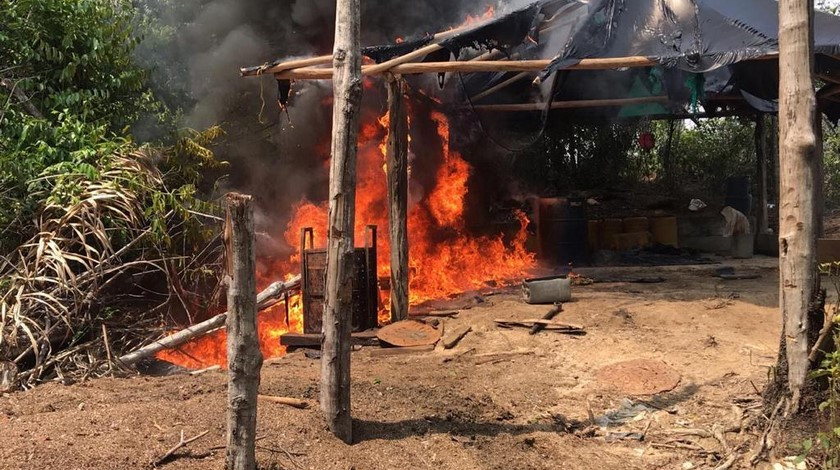 Sobre la estructura ilegal destruida por los uniformados, se detalló que tenía bases en madera, sin paredes, techo en plástico color negro, piso en tierra y en su interior había canecas con alcaloide.