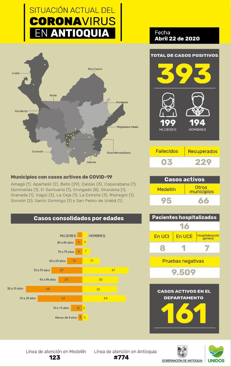 La Secretaría Seccional de Salud de Antioquia, informó el día de hoy, que el departamento sumó 27 nuevos casos de COVID-19, veinte (20) están en Medellín, dos (2) en Copacabana y cinco (5) en Bello, llegando así a un total de 393.