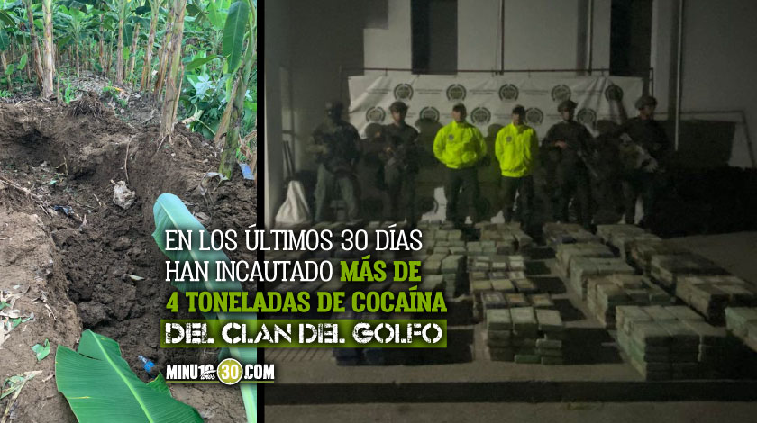 En los últimos 30 días operaciones conjuntas realizadas por la Fiscalía General de la Nación, la Armada Nacional y la Policía Antinarcóticos han permitido la incautación de más de 4 toneladas de cocaína en los municipios de Turbó y Necoclí, Urabá antioqueño. Todo el alcaloide decomisado era de propiedad del Clan del Golfo.