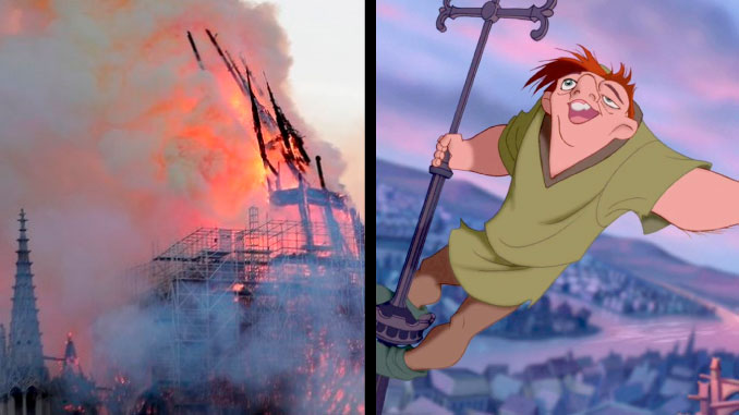 Muchos asocian la catedral de Notre Dame a la película de “El jorobado de Notre Dame”. La torre en la que aparece amarrado en esta escena el jorobado es la que se ha derrumbado por las llamas. pic.twitter.com/KYsBdn7xwH