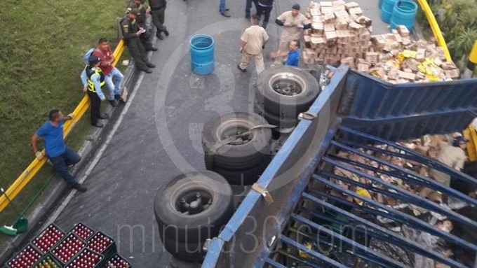 Minuto30.com- Sobre la 1:30 de la tarde de este viernes 9 de marzo un camión de una reconocida marca de gaseosas se volcó en la calle 30, cerca de la estación Industriales del Metro.