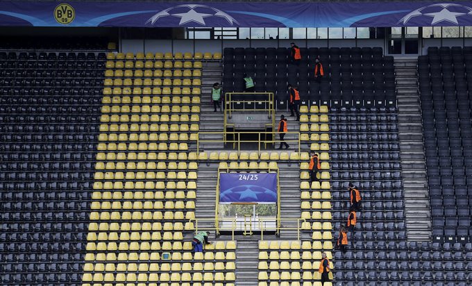 Miembros del personal de seguridad comprueban hoy las gradas del estadio Signal Iduna Park en Dortmund (Alemania). EFE
