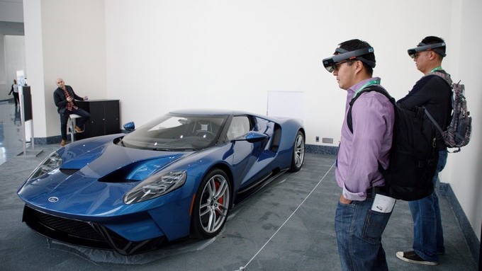 Los visitantes usan auriculares HoloLens para ver un Ford GT40 hoy, martes 28 de noviembre de 2017, previo a la apertura de la LA AutoMobility, en Los Ángeles (EE.UU.). EFE