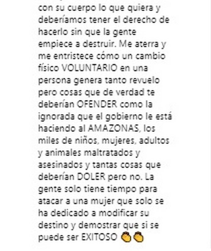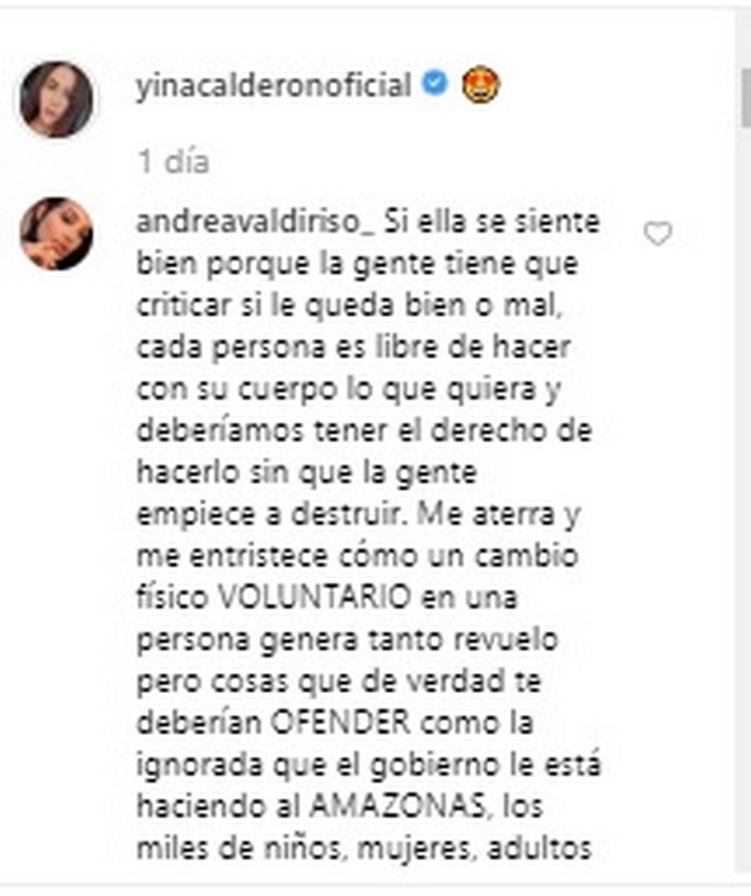 Ante las críticas, la influencer Andrea Valdiri dejó un largo comentario en el que invita a las personas que dejen vivir. “Si ella se siente bien porque la gente tiene que criticar si le queda bien o mal, cada persona es libre de hacer con su cuerpo lo que quiera y deberíamos tener el derecho de hacerlo sin que la gente empiece a destruir”.