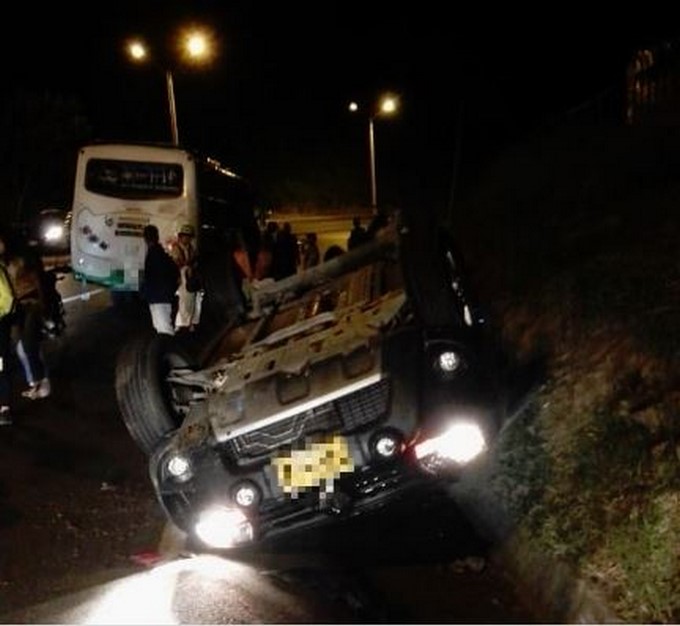 Siendo las 7:30 de la noche aproximadamente, se registró el accidente en la autopista Medellín – Bogotá a la altura del peaje llegando a la capital antioqueña, en el que un vehículo particular se volcó tras impactar con un bus de transporte público.