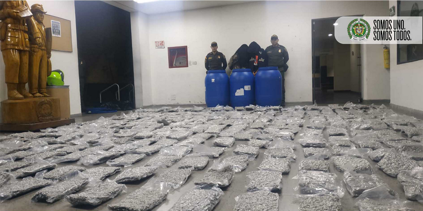 El hecho se presentó en una casa ubicada en la calle 75 con carrera 42 del barrio El Carmelo de Itagüí, donde los uniformados encontraron tres canecas azules, en las cuales estaban camuflados un total de 187 kilos de marihuana cripy, distribuida en 374 bolsas de 500 gramos cada una.