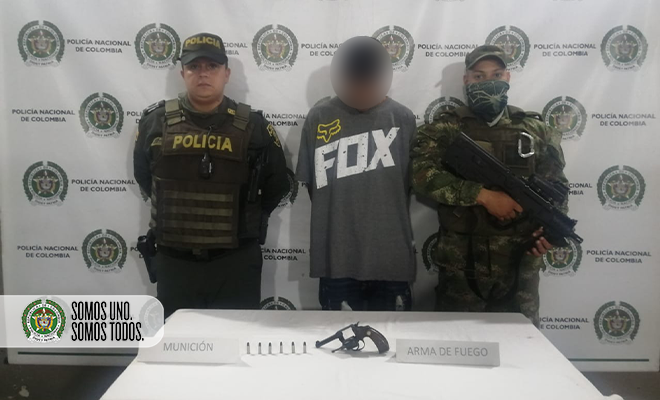 Así mismo, en el municipio de Bello tras la ejecución de labores de patrullaje, registro y control acompañadas por el Ejército Nacional en el barrio Las Cometas, se logró en la avenida 32 con calle 59, la captura de un hombre de 21 años de edad cuando portaba un arma de fuego tipo revólver calibre 32, con 6 cartuchos para el mismo.