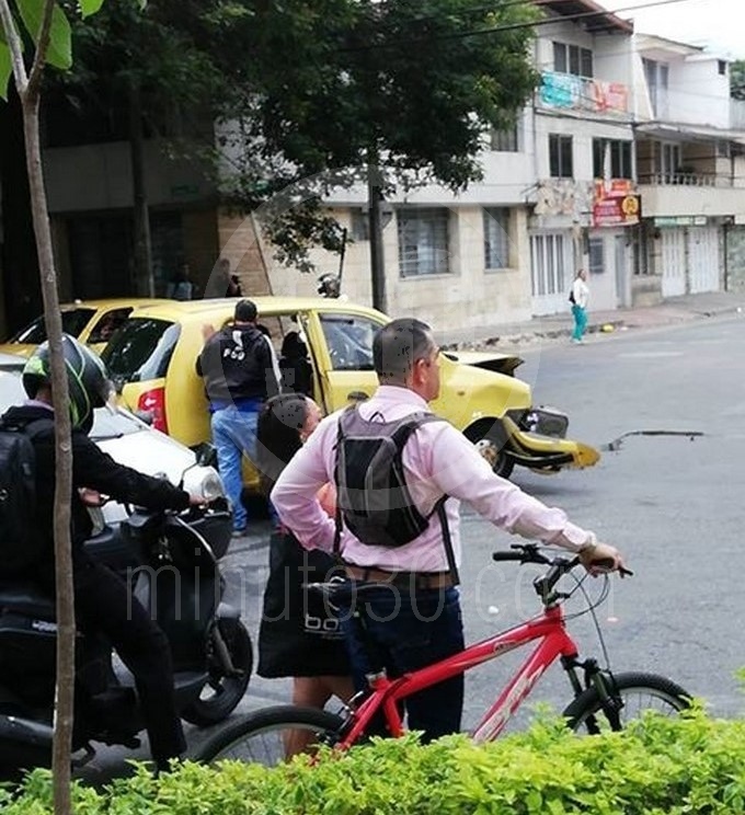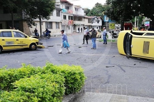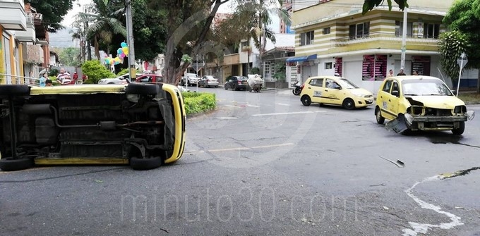 En la zona hay una señal de pare la cual presuntamente uno de los taxis se “tragó”, provocando el impacto entre los dos carros. Debido al fuerte choque uno de los vehículos terminó volcado en medio de la vía.