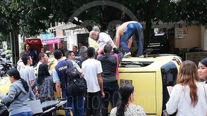 En la zona hay una señal de pare la cual presuntamente uno de los taxis se “tragó”, provocando el impacto entre los dos carros. Debido al fuerte choque uno de los vehículos terminó volcado en medio de la vía.