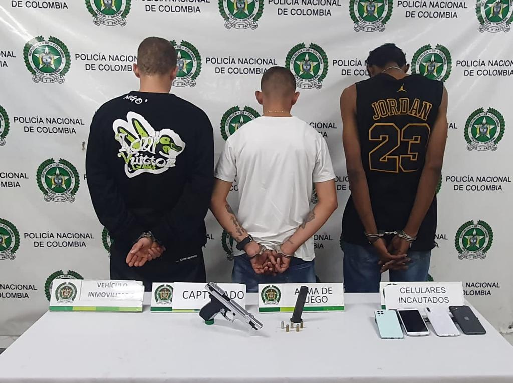 Los 3 victimarios fueron interceptados a la altura de la autopista sur, en un vehículo, tipo furgón. A estas personas les incautaron un arma de fuego de menor letalidad, calibre 9 milímetros y se recuperaron 5 teléfonos celulares que habían sido hurtados.