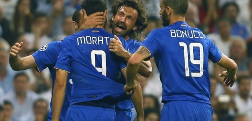 Los jugadores de la Juventus felicitan a Morata (i) tras marcar ante el Real Madrid, durante el partido de vuelta de la semifinal de la Liga de Campeones disputado en el estadio Santiago Bernabéu, en Madrid. EFE