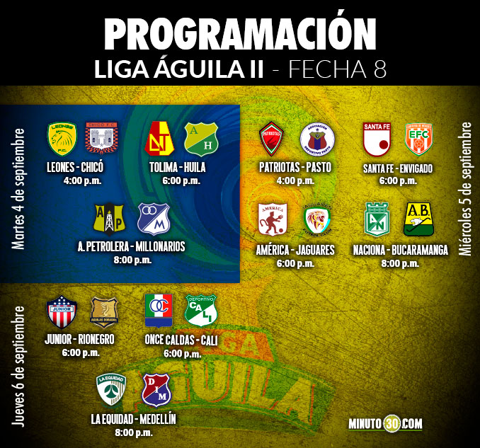Minuto30.com- La Dimayor dio a conocer este miércoles la programación de la octava fecha de la Liga Águila II-2018, que se cumplirá entre el 4 y el 6 de septiembre, a mediados de la semana.