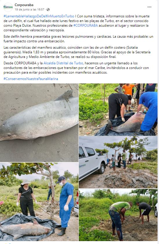 Según la valoración realizada por Corporación para el Desarrollo Sostenible del Urabá (Corpurabá), entidad encargada de verificar por qué se produjo el deceso del mamífero, el delfín habría sido golpeado por una embarcación.