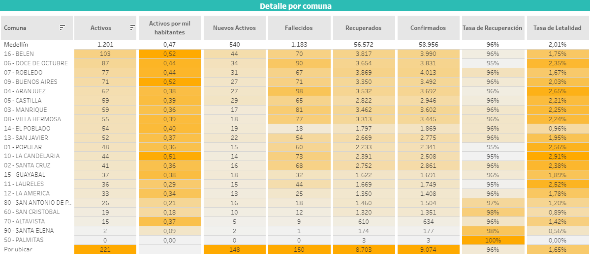 Así las cosas, en Medellín hay, con el último reporte, 1.201 casos activos de covid-19 en la ciudad, con la salvedad que, de todos estos, solo hay una comuna que supera los 100 casos, y es la 16, Belén.
