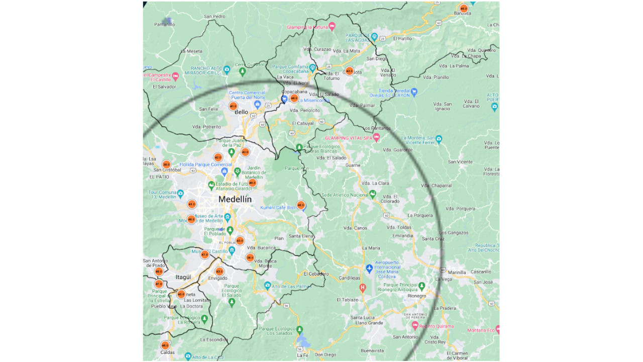 De acuerdo con el reporte del Sistema de Alerta Temprana de la ciudad y el Valle de Aburrá, en naranja están las estaciones de calidad del aire de Medellín y sus municipios aledaños.